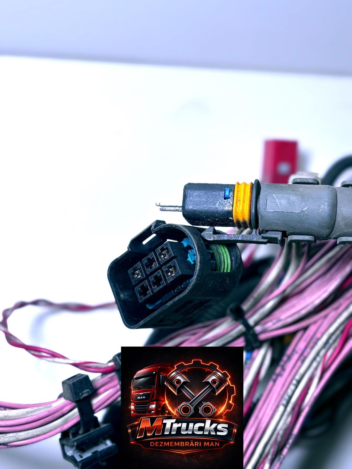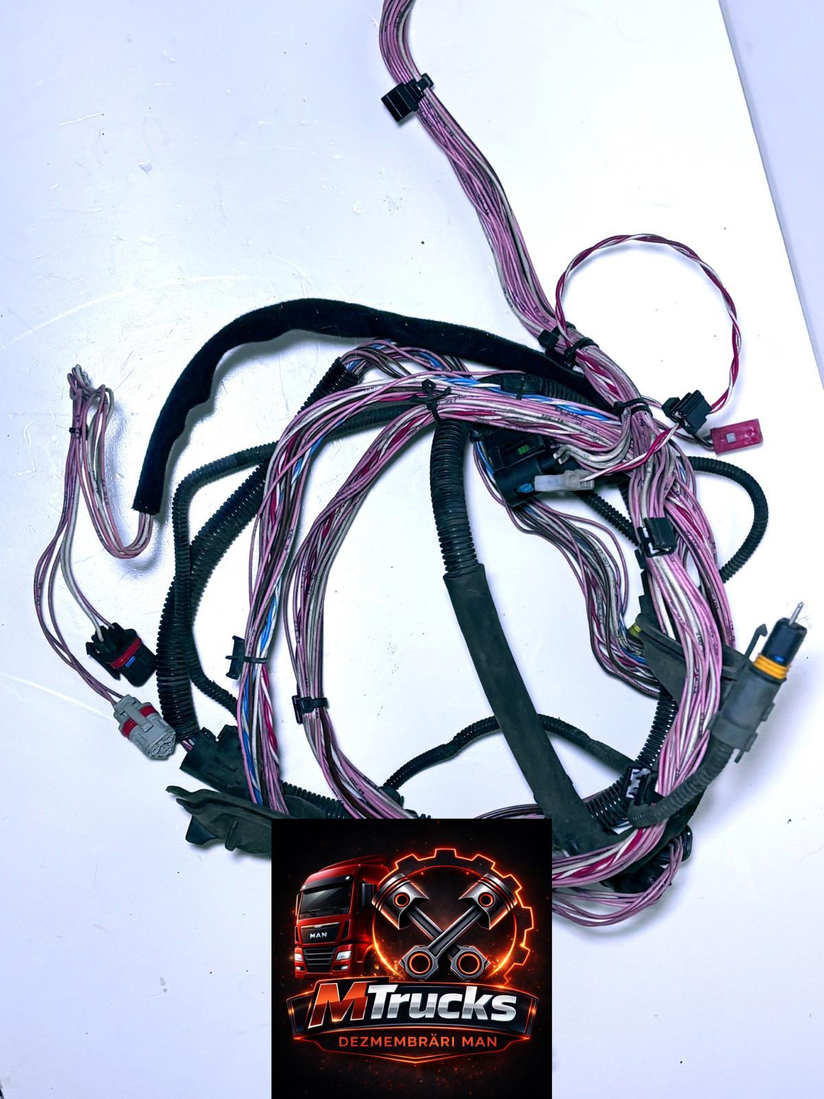 Cablaj ușă MAN, instalație electrică completă pentru ușă șofer sau ușă pasager, piesă originală MAN Genuine Parts. Cablajul face legătura dintre ușă și instalația electrică principală a cabinei și este responsabil pentru alimentarea și funcționarea tuturor comenzilor electrice din ușă. Este vorba despre instalația completă OEM MAN, cu mufe originale, traseu corect și configurație specifică fiecărui tip de ușă și nivel de echipare.